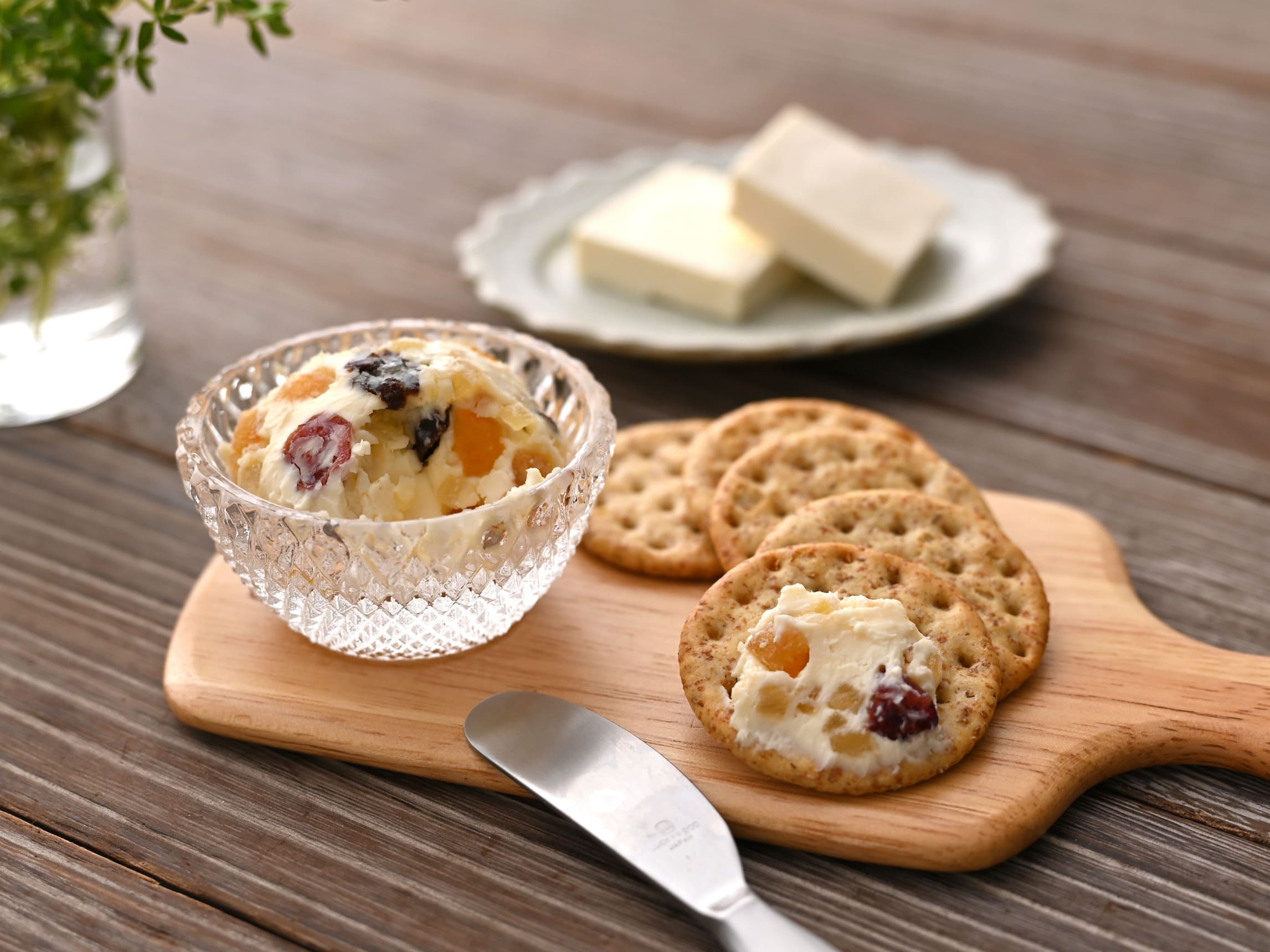 - ボウルにフィラデルフィアを入れてなめらかになるまで混ぜ、ドライフルーツを加えて混ぜ合わせます。