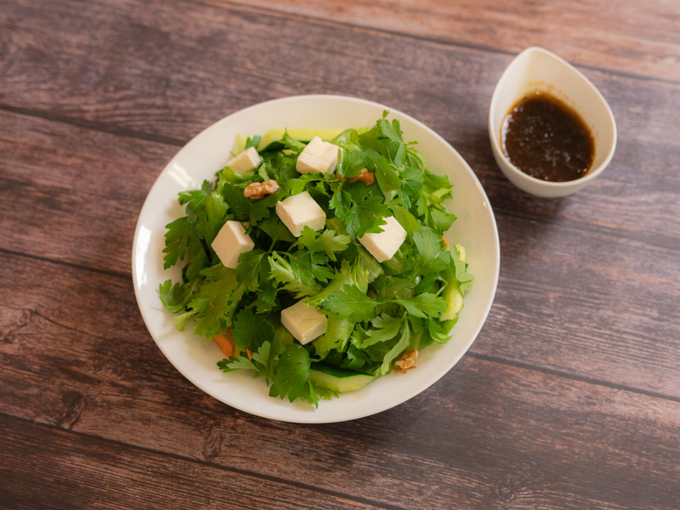 - 器にリーフレタス、きゅうり、にんじんを盛り付け、上にイタリアンパセリ、フィラデルフィア、くるみをトッピングします。