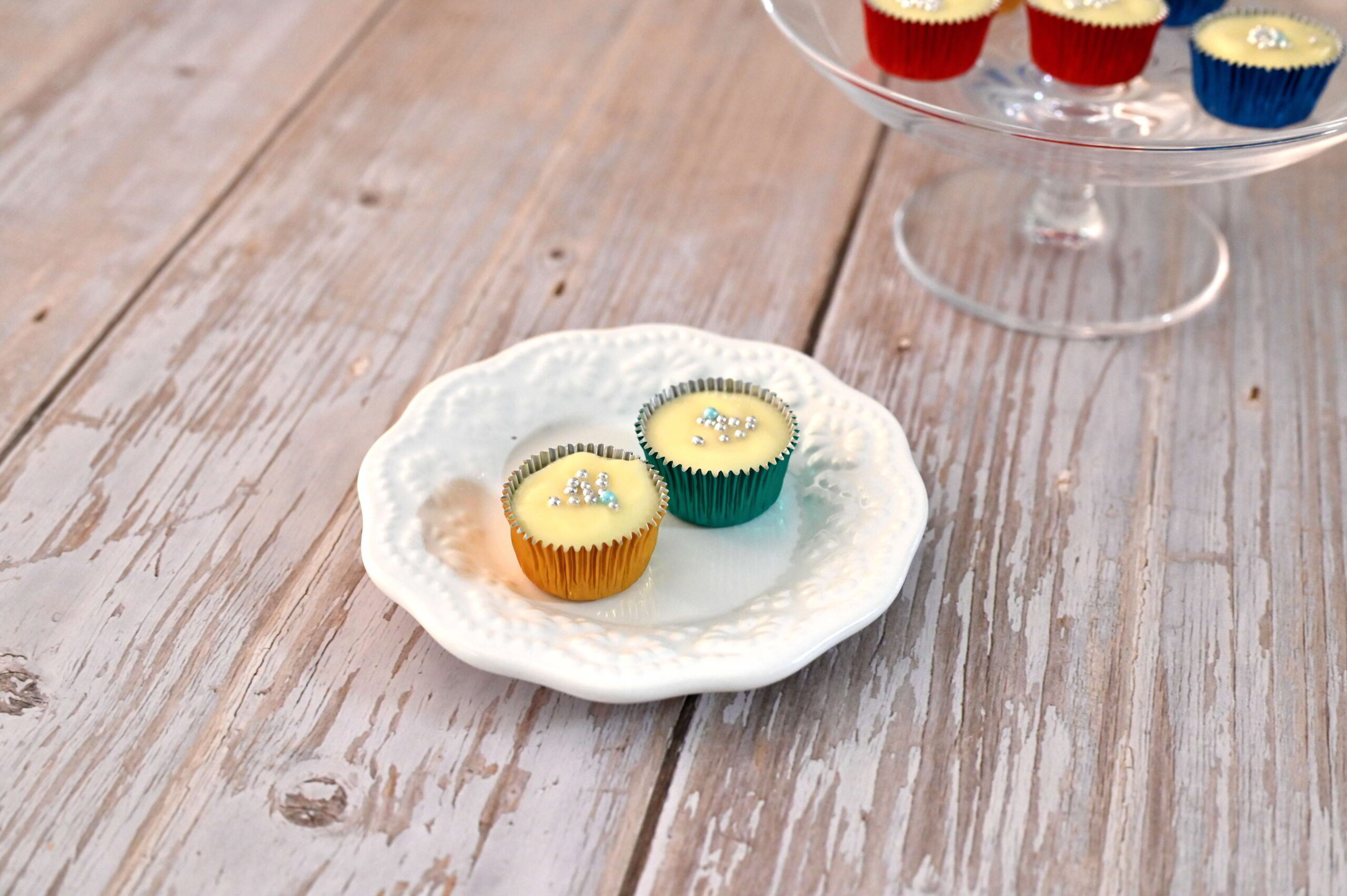 3を絞り袋に入れアルミカップに絞り、お好みでアラザンなどを飾ります。 冷蔵庫で3時間以上冷やし固めます。