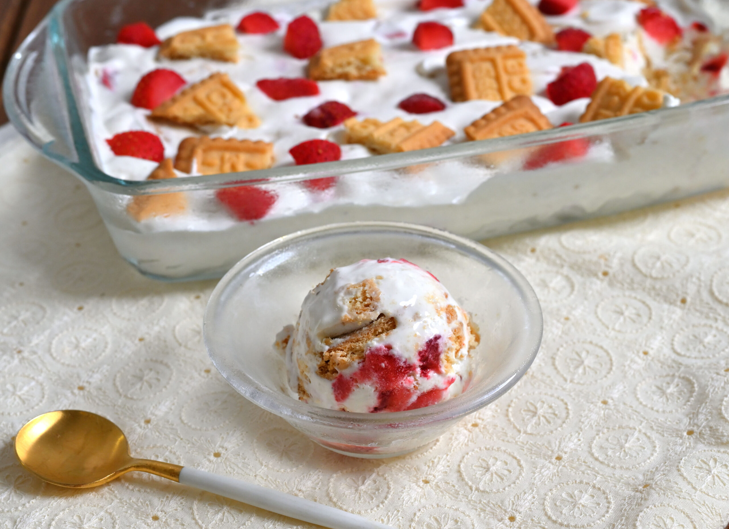 アイスの表面をならした後、さらにいちごやクッキーを飾るとかわいく仕上がります。